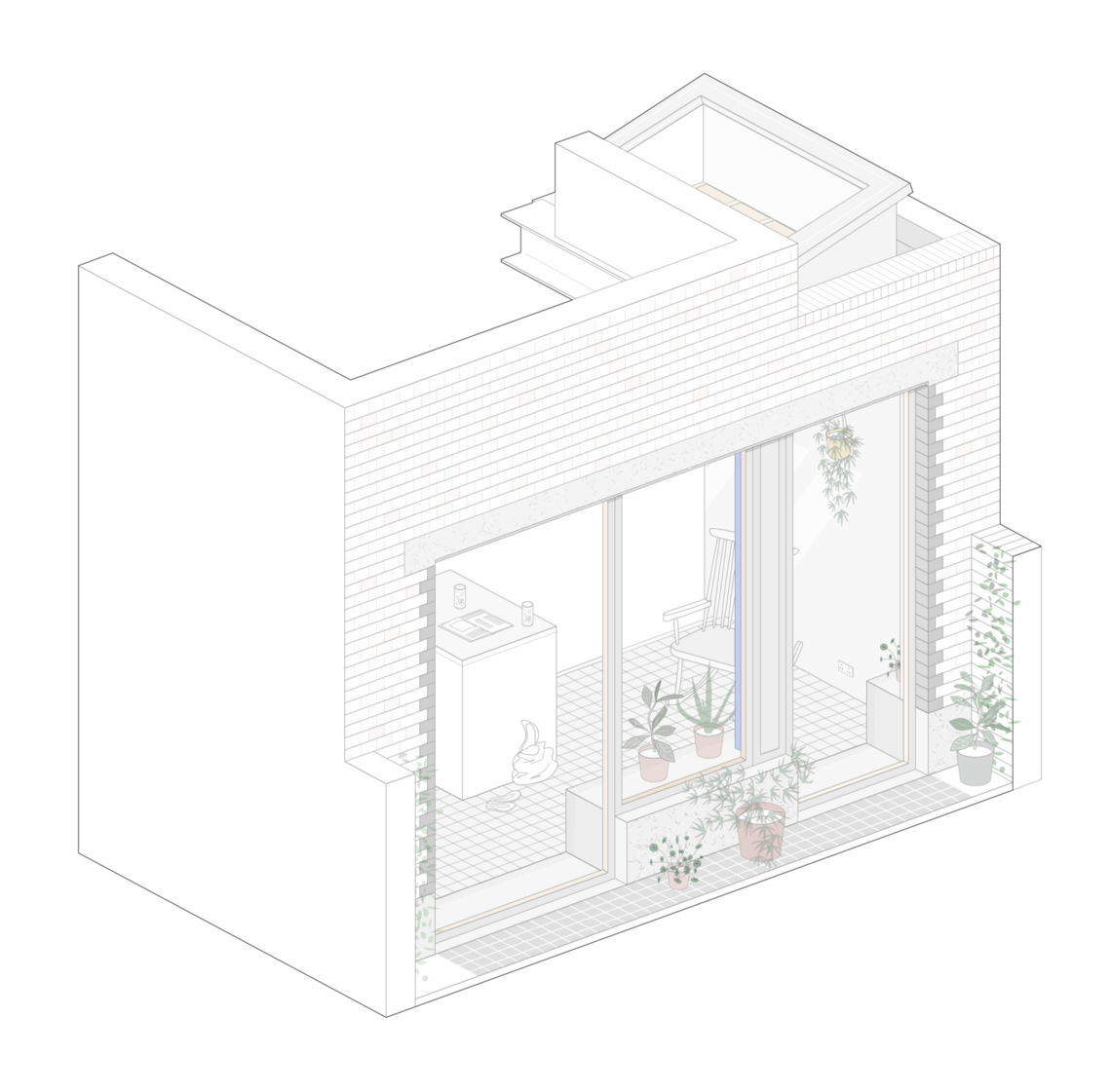 Interior finishes are chosen to compliment the client's existing furniture and take cues from a set of ceramics objects provided by the client as initial material references.